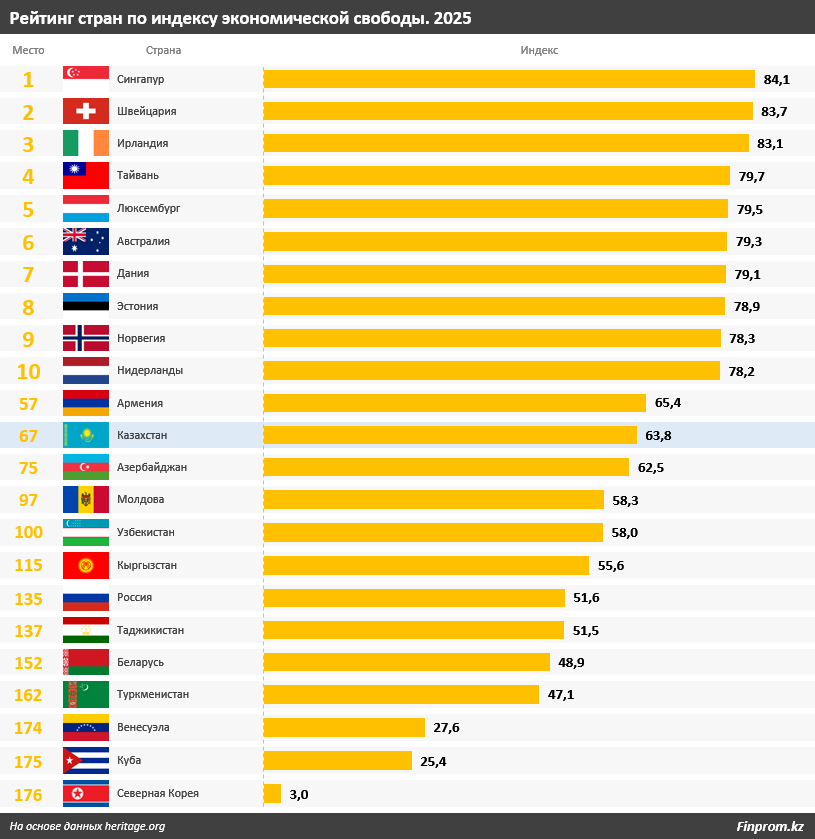 В обновлённом рейтинге стран по индексу экономической свободы Казахстан занял 67-е место из 176 государств, получив 63,8 балла. Это относит страну к категории «умеренно свободных» экономик, передает kazlenta.kz со ссылкой на finprom.kz.