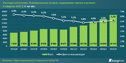 Во втором квартале 2025 года расходы населения на коммунальные услуги, содержание жилья и ремонт составили в среднем 16,3 тыс. тенге на человека в квартал – то есть около 5,4 тыс. тенге в месяц.