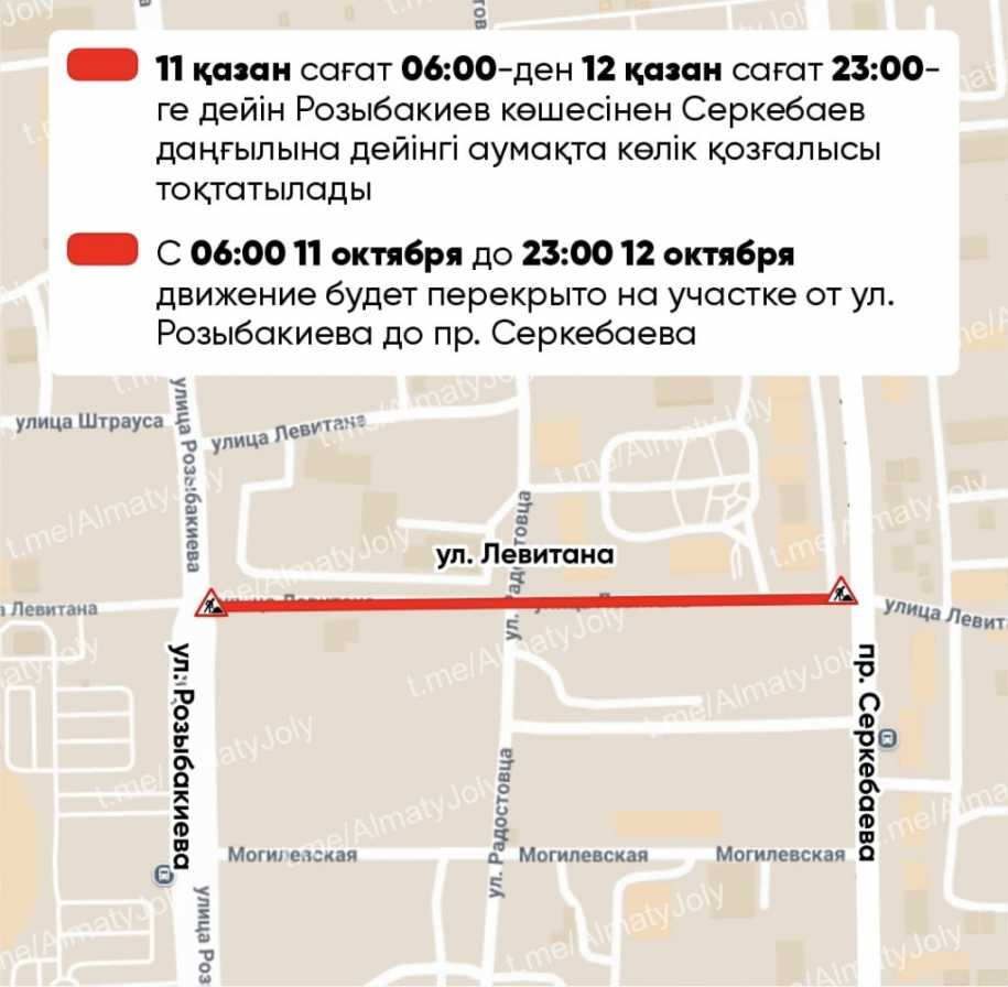 По информации пресс-службы акимат, с 06:00 ч. 11 октября до 23:00 ч. 12 октября движение транспорта будет перекрыто на участке от улицы Розыбакиева до проспекта Серкебаева. Ограничения вводятся из-за устройства наружных инженерных сетей водоснабжения в рамках строительства новой поликлиники на 500 посещений в день.