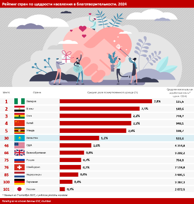 Исследование показало, что более высокую долю доходов на благотворительность жертвуют жители стран с невысоким уровнем дохода. Так, в первой пятёрке рейтинга оказались Нигерия (2,8%), Египет (2,5%), Гана (2,2%), Уганда (2%) и Китай (2,2%).