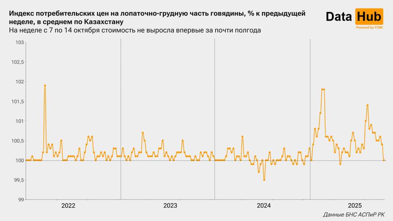 Впервые за шесть месяцев в Казахстане остановился рост цен на «социальную» говядину. По данным Бюро национальной статистики АСПиР РК, в период с 7 по 14 октября стоимость лопаточно-грудной части в среднем по стране не изменилась, передает kazlenta.kz со ссылкой на аналитический Telegram-канал DATA HUB.