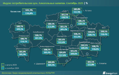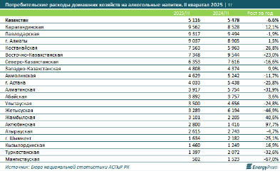 Больше всего на алкоголь тратят семьи Карагандинской области – 9,6 тыс. тенге (рост на 12,9%). Далее идут Павлодарская область (9,3 тыс., –1,9%) и Алматы (9 тыс., +1,5%). Минимальные расходы зафиксированы в Мангистауской области – всего 502 тенге, а также в Туркестанской (1,4 тыс.) и Кызылординской (1,5 тыс.) областях.