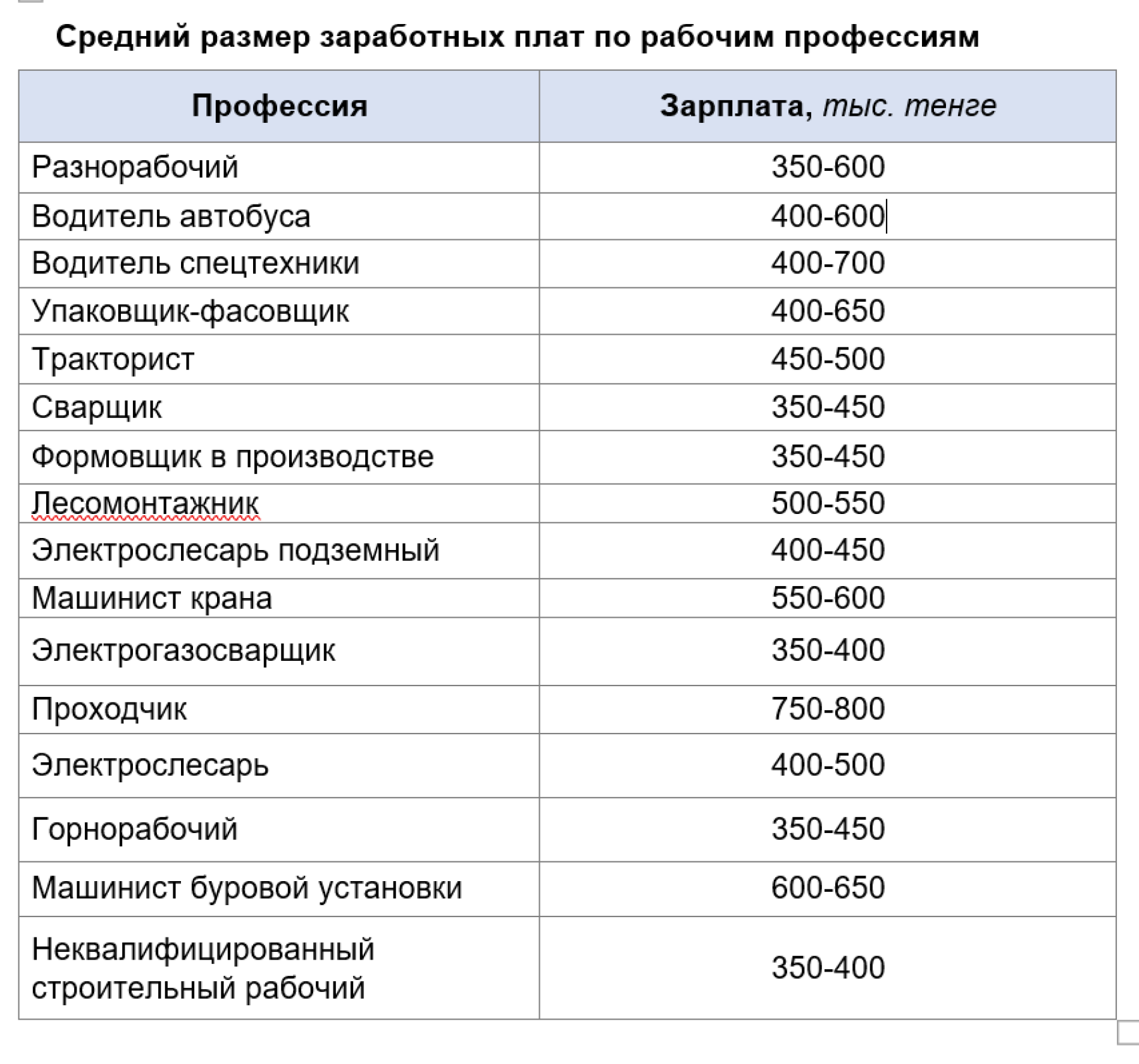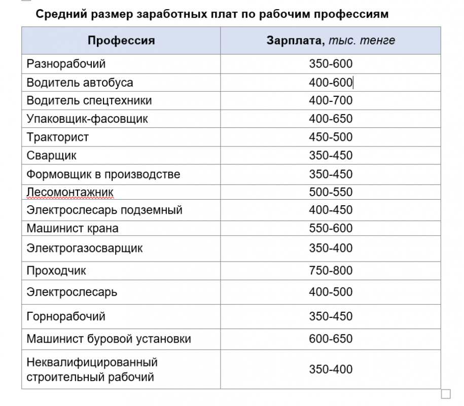 Справка. По данным Бюро национальной статистики, в период с января по июнь 2025 года среднемесячная заработная плата в Казахстане составила 434 789 тенге, в том числе в городской местности – 458 189 тенге, в сельской местности – 365 134 тенге.Бюро национальной статистики отмечает, что наиболее востребованными рабочими профессиями в городской местности являются разнорабочие (зарплаты от 350 до 600 тысяч тенге), водители автобусов (400 - 600 тысяч тенге), упаковщики-фасовщики (400-650 тысяч тенге), машинисты спецтехники (400-700 тысяч тенге), трактористы (350-450 тысяч тенге) и сварщики (от 350 тысяч тенге).