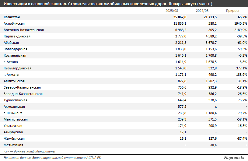 Проблемы транспортно-логистической системы в Казахстане остаются актуальными и требуют значительных инвестиций. По данным Бюро национальной статистики, в январе–августе 2025 года инвестиции в строительство автомобильных и железных дорог составили 35,9 млрд тенге, что на 65,2% больше, чем годом ранее.