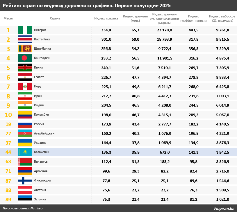 По итогам первого полугодия 2025 года Казахстан занял 44-е место из 89 стран в рейтинге Numbeo по индексу дорожного трафика. Индекс нашей страны составил 136,3. Чем выше показатель, тем сложнее дорожная ситуация в стране, и наоборот, передает kazlenta.kz со ссылкой на finprom.kz.