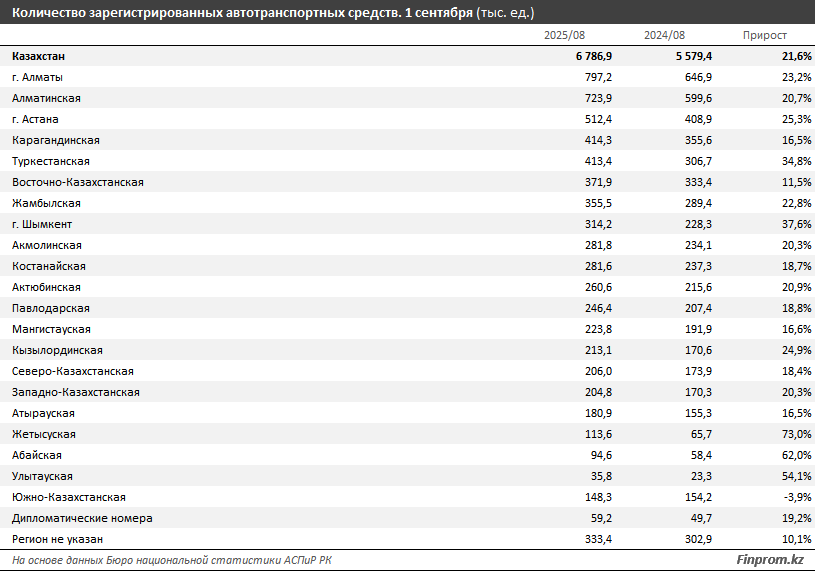 На 1 сентября 2025 года в Казахстане зарегистрировано 6,8 млн транспортных средств, что на 21,6% больше, чем годом ранее. Из них: