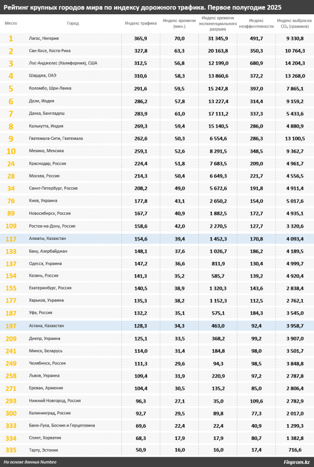 - Астана заняла 197-е место из 335 с индексом 128,3. Среднее время в пути – 34,3 минуты, индекс неэффективности — 92,4, индекс выбросов CO₂ – 3958,7 грамма.