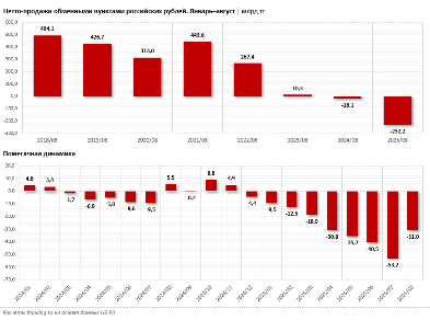 В 2024 году отрицательные объёмы нетто-продаж фиксировались в 7 из 12 месяцев, а в 2025 году – все восемь месяцев подряд. Наибольшие показатели пришлись на летний период: