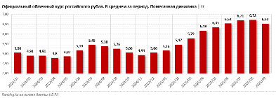 На фоне снижения спроса курс российского рубля в Казахстане, напротив, растёт. В сентябре он составлял 6,53 тенге, что на 26,6% выше, чем в январе, и на 24,1% выше, чем годом ранее.
