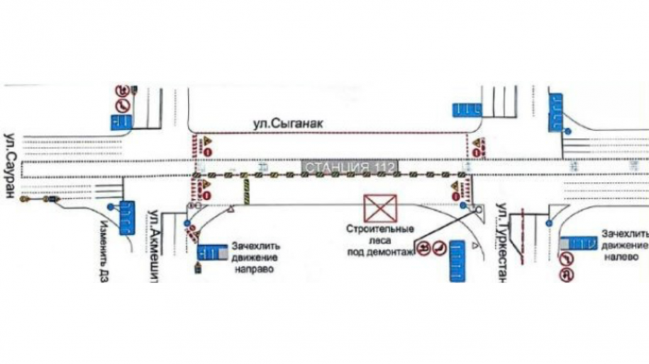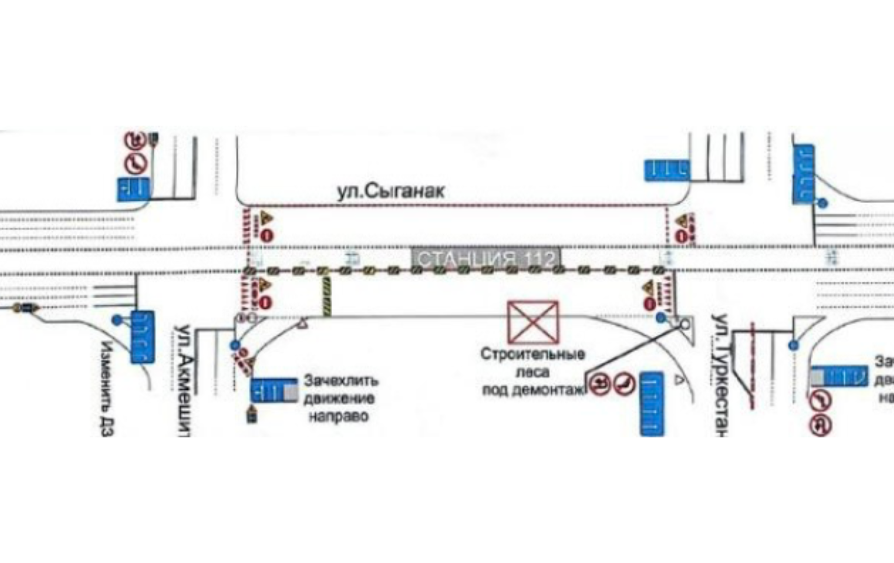 В связи с проведением работ будет полностью ограничено движение по южной стороне улицы Сыганак – на участке пересечения улиц Акмешит и Туркестан.