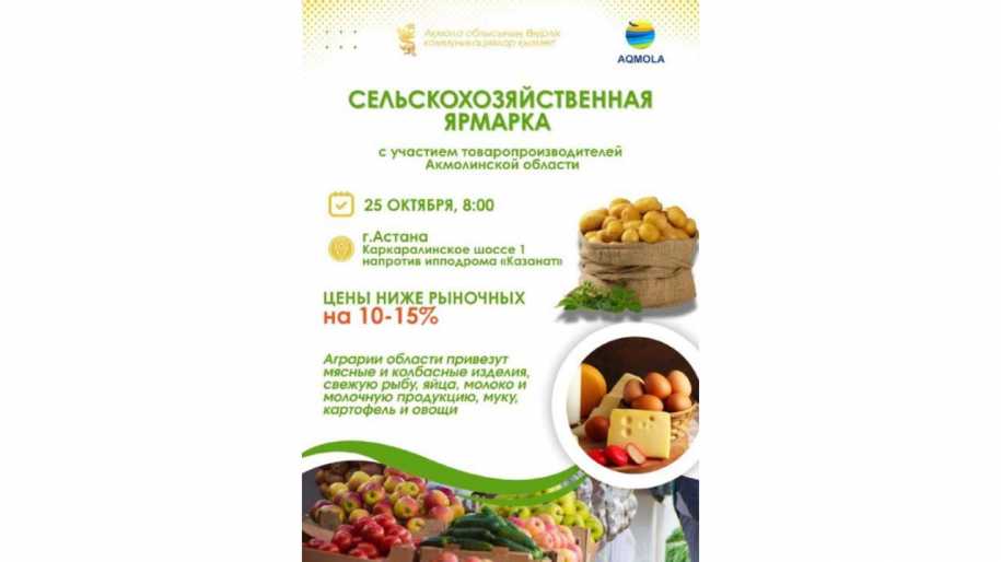 В День Республики 25 октября в Астане пройдет заключительная сельскохозяйственная ярмарка с участием товаропроизводителей Акмолинской области. Мероприятие будет проходить только один день, передает kazlenta.kz со ссылкой на акимат.