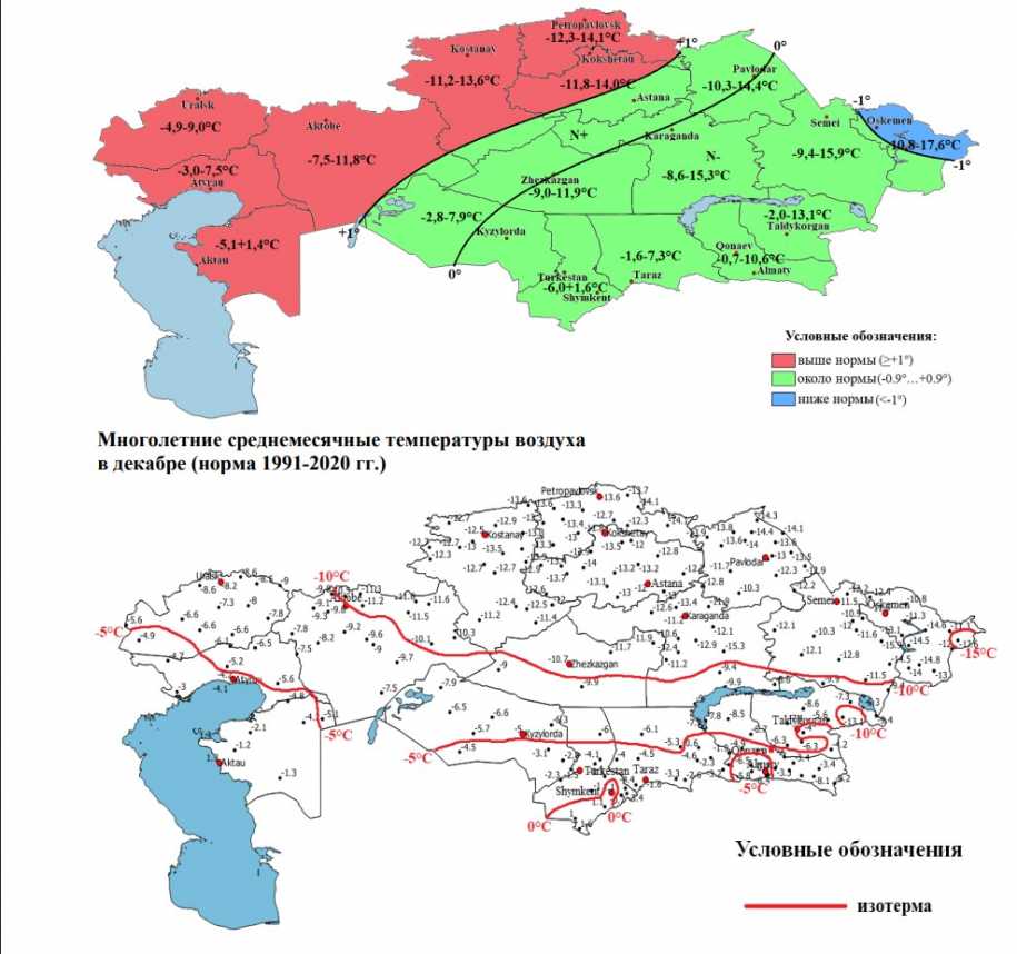 В декабре средняя за месяц температура воздуха ожидается около нормы на большей части территории страны, выше нормы на 1° – в северо-западной половине республики, ниже нормы на 1° - на северо-востоке ВосточноКазахстанской области.