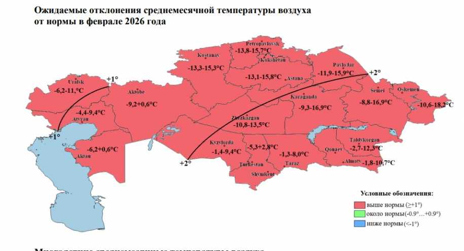 В январе средняя за месяц температура воздуха ожидается около нормы набольшей части республики, ниже нормы на 1° - в области Абай, в ВосточноКазахстанской области, в области Жетісу, на большей части Алматинской, на востоке Карагандинской, на юго-востоке Павлодарской области.