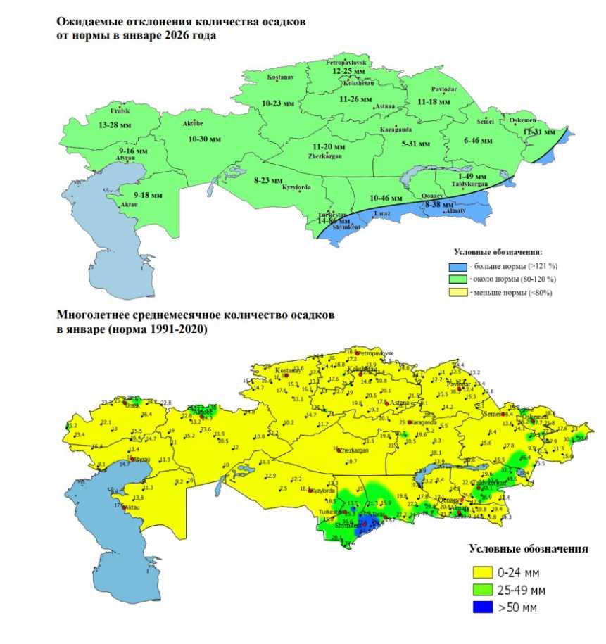 Количество осадков в январе предполагается около нормы на большей части республики, больше нормы - на юго-востоке Туркестанской, в южной половине Жамбылской, Алматинской областей, на юго-востоке ВосточноКазахстанской и области Жетісу.