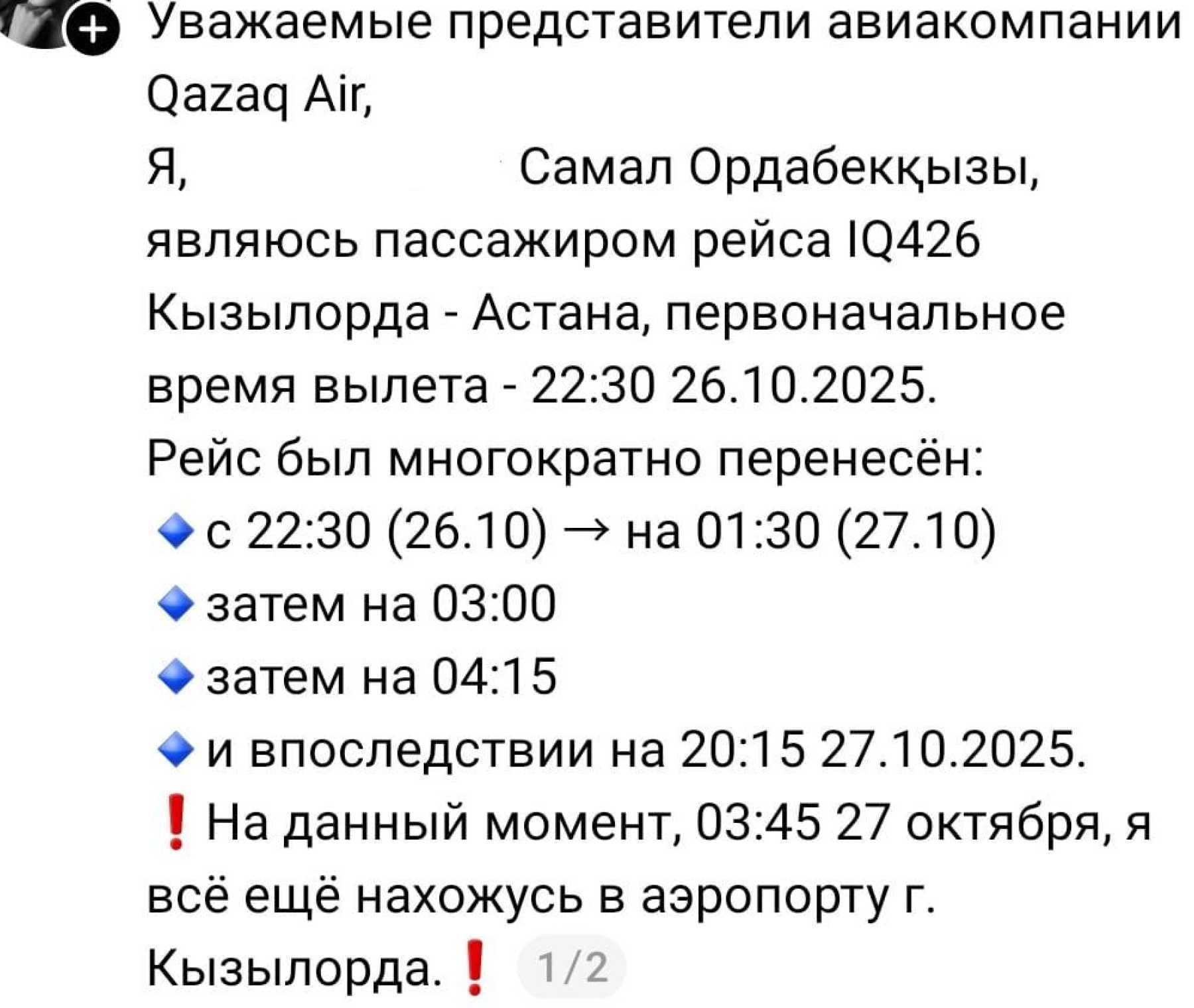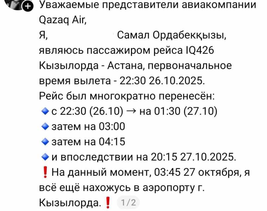Казахстанка Самал опубликовала пост в Threads, сообщив, что должна была вылететь из Кызылорды в Астану рейсом IQ426 ещё в 22:30 26 октября.