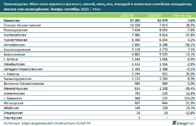 За январь–сентябрь 2025 года в Казахстане произведено 57,3 тыс. тонн свежего и охлаждённого мяса – на 7,6% меньше, чем за тот же период прошлого года, передает kazlenta.kz со ссылкой на energyprom.kz.