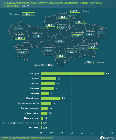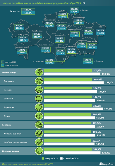 Рост цен в сентябре наблюдался во всех регионах страны. Больше всего мясо подорожало в Западно-Казахстанской (+4,9%), Северо-Казахстанской (+4,2%) и Актюбинской (+4,0%) областях. Минимальный рост отмечен в Туркестанской области (+1,4%).