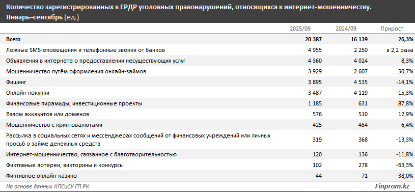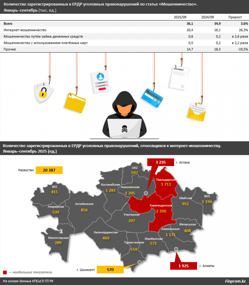 В Казахстане зафиксирован очередной всплеск интернет-мошенничества. По данным Комитета по правовой статистике и специальным учётам Генеральной прокуратуры РК, за девять месяцев 2025 года в Едином реестре досудебных расследований зарегистрировано 20,4 тыс. уголовных правонарушений, связанных с интернет-мошенничеством. Это на 26,3% больше, чем за аналогичный период прошлого года, передает kazlenta.kz со ссылкой на finprom.kz.