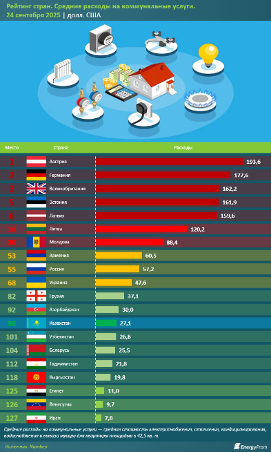 Таким образом, коммунальные расходы в Казахстане более чем в семь раз ниже, чем в Австрии, и в два–три раза меньше, чем у соседей по ЕАЭС.