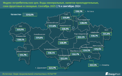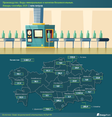 В Казахстане за январь–сентябрь текущего года произведено 3,1 млрд литров минеральной воды и безалкогольных напитков, что на 23,9% больше, чем за аналогичный период 2024 года, передает kazlenta.kz со ссылкой на energyprom.kz.