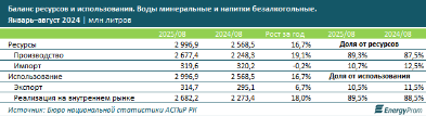 За январь–август текущего года отечественные производители обеспечили 89,3% спроса на минеральную воду и безалкогольные напитки, против 87,5% годом ранее. Импорт составил 10,7% от общего объёма, или 319,6 млн литров, что почти соответствует прошлогоднему уровню (–0,2%).