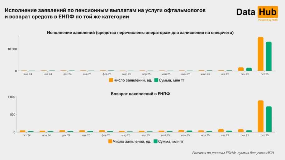 По данным ЕНПФ, в октябре было исполнено 15,4 тыс. заявлений на единовременные пенсионные выплаты с целью получения офтальмологических услуг. Это в 10 раз больше, чем в сентябре, и в 73 раза превышает средний показатель за январь–август 2025 года, передает kazlenta.kz со ссылкой на аналитический Telegram-канал DATA HUB.