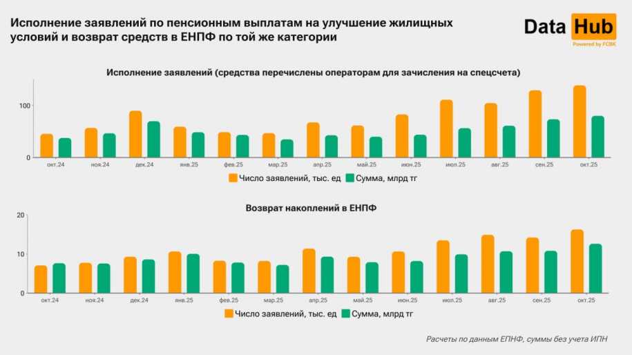 В октябре число исполненных заявлений достигло 138,4 тыс. (рост на 7%), а сумма выплат – 79,9 млрд тенге (рост на 9%).