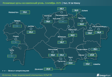 Средняя розничная цена угля в сентябре 2025 года составила 19,6 тыс. тенге за тонну.