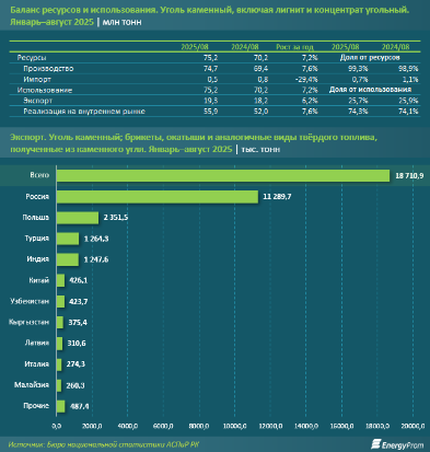 Главным направлением остается Россия, куда ушло 11,3 млн тонн угля на 114,8 млн долларов. Кроме того, значительные объемы поставлялись в Польшу (2,4 млн тонн), Турцию (1,3 млн тонн), Индию (1,2 млн тонн) и Китай (426 тыс. тонн).
