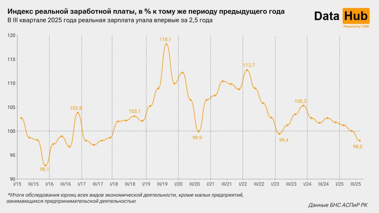 За последние почти восемь лет в Казахстане наблюдался стабильный рост реальной зарплаты (+6% в среднем за год). Текущее снижение стало лишь третьим за этот период, но самым сильным: ранее фиксировались падения на -0,6% (I квартал 2023 года) и -0,1% (III квартал 2020 года).
