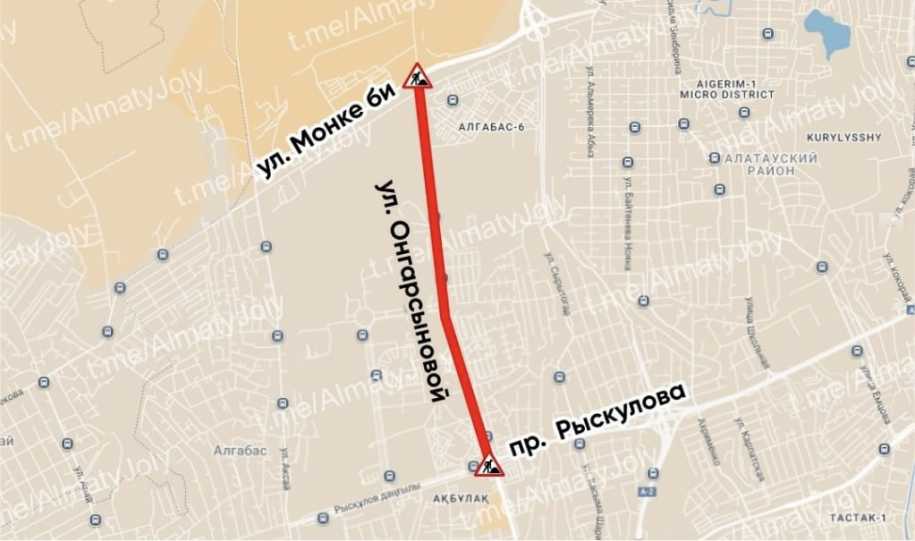 По данным пресс-службы акимата, движение будет полностью перекрыто с 13:00 ч. 12 ноября до 23:00 ч. 13 ноября на участке от улицы Монке би до проспекта Т. Рыскулова.