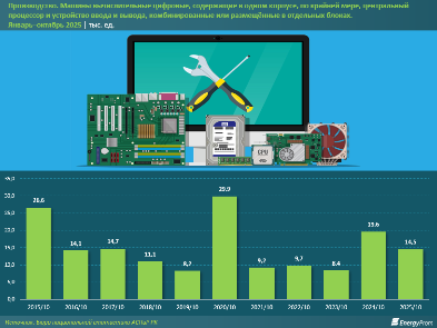 Выпуск цифровых вычислительных машин снизился на 26,2% по сравнению с аналогичным периодом прошлого года. Годом ранее сектор демонстрировал резкий рост – в 2,3 раза.