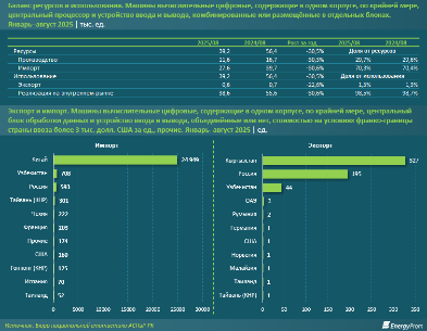 Экспорт казахстанских вычислительных машин остаётся символичным: за восемь месяцев отправлено лишь 577 единиц, что на 22,6% ниже прошлогодних показателей. Продажи на внутреннем рынке также упали – до 38,6 тыс. единиц (–30,6%).