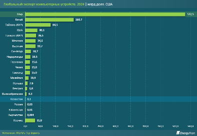Казахстан занял 49-е место с экспортом компьютерной техники на сумму 97,7 млн долларов. Казахстанская статистика за 2024 год фиксирует близкий показатель – 99,3 млн долларов.