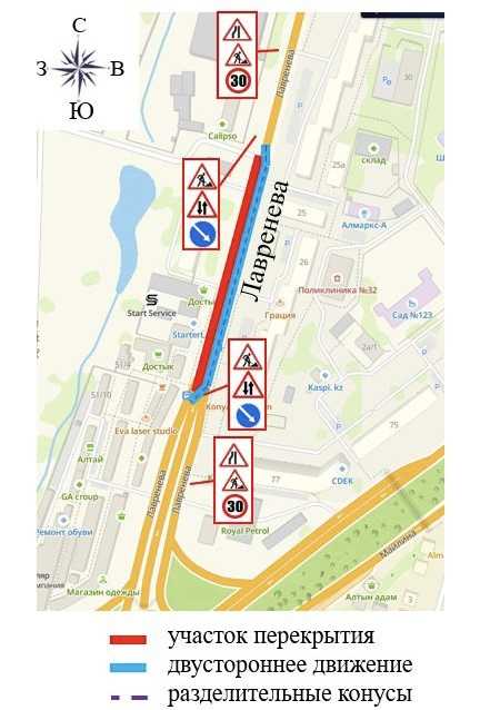 По данным пресс-службы акимата, движение автотранспорта будет перекрыто по западной стороне улицы Лавренева – на отрезке от дома № 43а по улице Наманганской до улицы Майлина. Транспорт направят по восточной стороне в обоих направлениях.