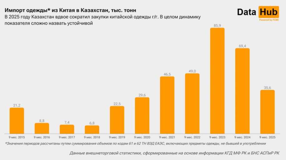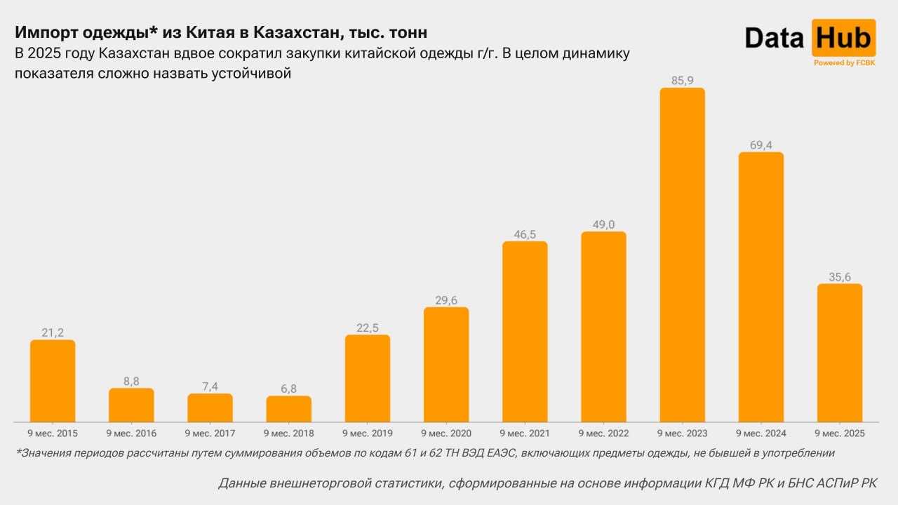 За январь–сентябрь в Казахстан было ввезено 35,6 тыс. тонн одежды из Китая – на 49% меньше, чем за аналогичный период прошлого года. Последний раз более низкие показатели наблюдались в 2020 году, следует из официальной внешнеторговой статистики, передает kazlenta.kz со ссылкой на аналитический Telegram-канал DATA HUB.