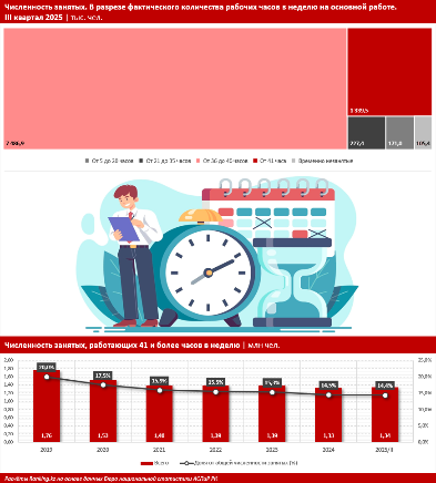 В Казахстане более 1,3 млн человек – или 14,4% занятого населения – работают свыше рекомендуемого «золотого стандарта» в 40 часов в неделю. Такие данные приводят выборочные обследования Бюро национальной статистики АСПиР РК. Об сообщается в аналитическом обзоре ranking.kz, передает kazlenta.kz.