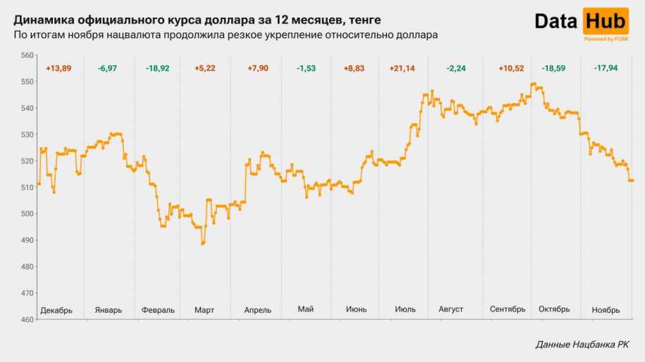 Ноябрь завершился заметным укреплением тенге по отношению к доллару США. По данным Национального банка РК, на 1 декабря курс американской валюты составляет 512,53 тенге – это на 3,4% (17,94 тенге) ниже, чем месяцем ранее, передает kazlenta.kz со ссылкой на аналитический Telegram-канал DATA HUB.