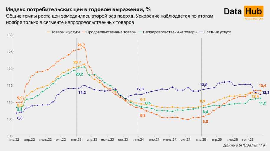 Годовая инфляция в ноябре составила 12,4% против 12,6% в октябре, свидетельствуют данные Бюро национальной статистики. Впервые за последние 12 месяцев замедлился и рост цен на продовольственные товары – до 13,4% с 13,5% месяцем ранее, передает kazlenta.kz со ссылкой на аналитический Telegram-канал DATA HUB.