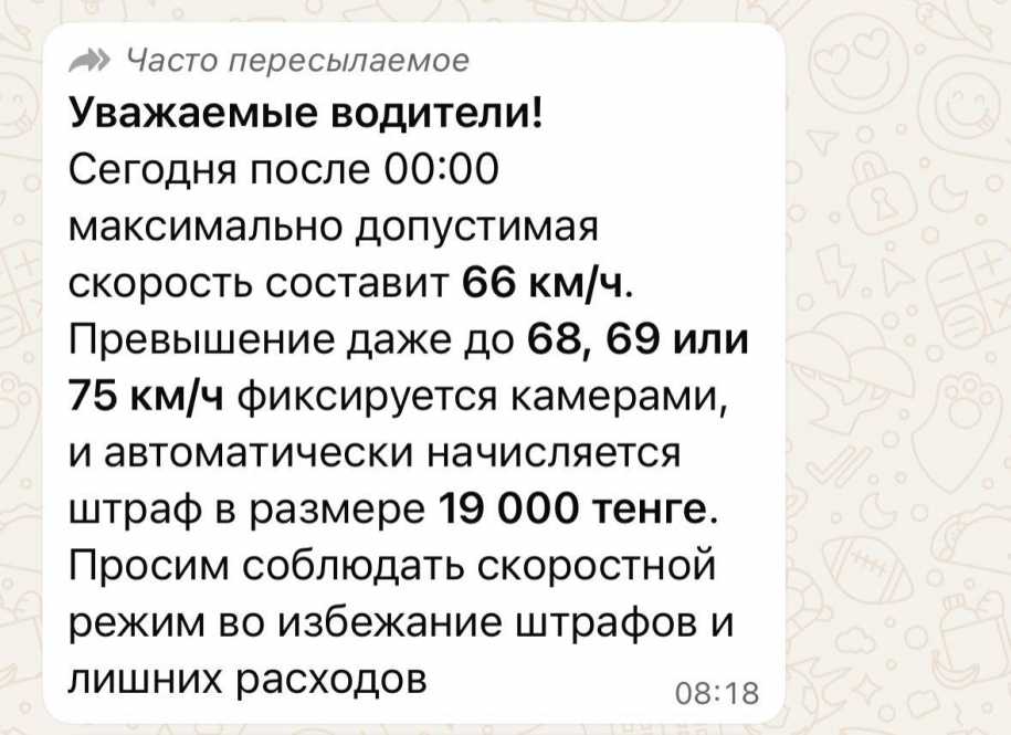 Министерство внутренних дел Казахстана опровергло распространяемое в мессенджерах сообщение о том, что после полуночи якобы вводится «максимально допустимая скорость 66 км/ч». В ведомстве подчеркнули, что подобная информация не соответствует действительности, передает kazlenta.kz.