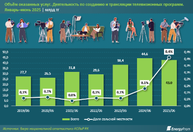 Несмотря на усиливающуюся конкуренцию со стороны цифровых платформ, телевидение остаётся одним из ключевых медиаканалов в Казахстане. За январь–июнь текущего года объём услуг по созданию и трансляции телепрограмм составил 43 млрд тг – всего на 3,6% ниже уровня аналогичного периода 2024 года. Для сравнения, годом ранее отрасль показывала рост на 16,2%, передает kazlenta.kz со ссылкой на energyprom.kz.