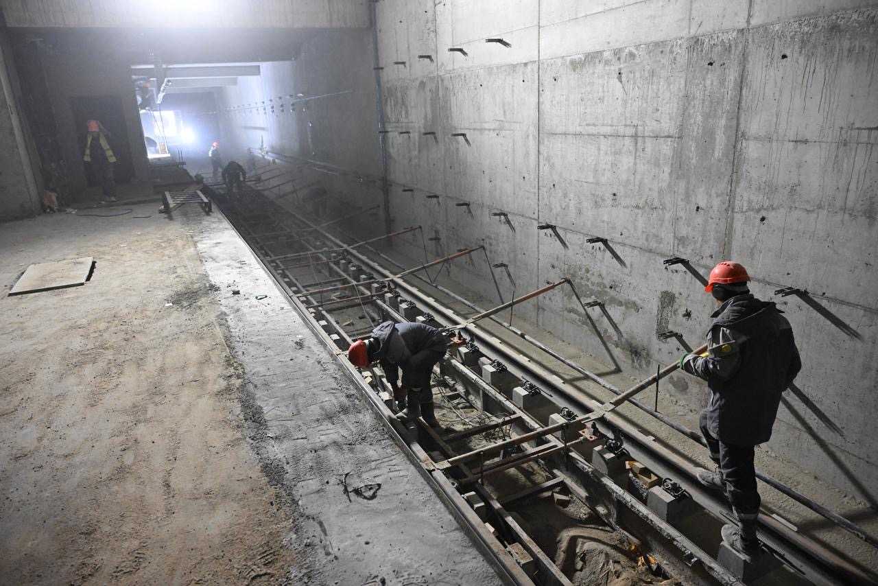 Завершена укладка рельсов в левом перегонном тоннеле и выполнены работы по освещению, прокладке кабелей, водопровода и дренажа, установке кронштейнов для инженерного оборудования. Предстоит монтаж систем видеонаблюдения, аудиооповещения, пожарной и охранной сигнализации.