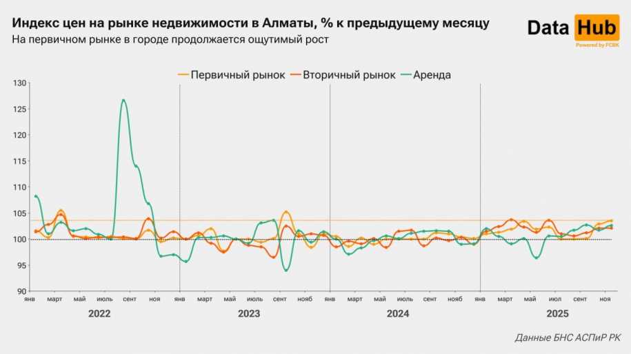 В Алматы подорожание первичного жилья оказалось более заметным – +3,5% к октябрю, что является самым значительным ростом за последние два года – с сентября 2023-го. Причём месяцем ранее в этом сегменте также фиксировались ощутимые изменения.