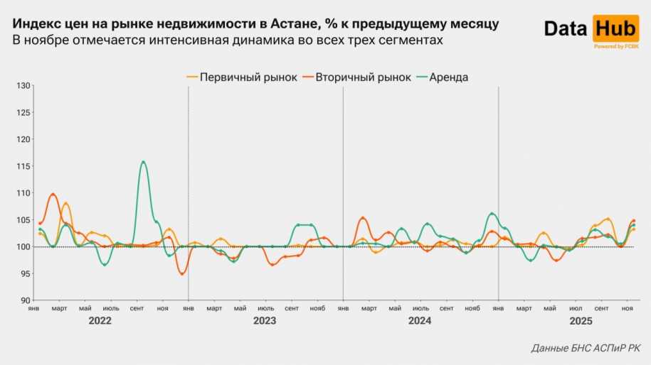 На первичном рынке тоже отмечен ощутимый рост – +3,2%, хотя ещё в сентябре показатель был выше (+5,1%). Рынок аренды жилья также показал активность – +4% к октябрю. Для ноября такие темпы роста на рынке съёмного жилья в Астане в последние годы считаются нетипичными; более серьёзные изменения фиксировались в декабре 2024-го.