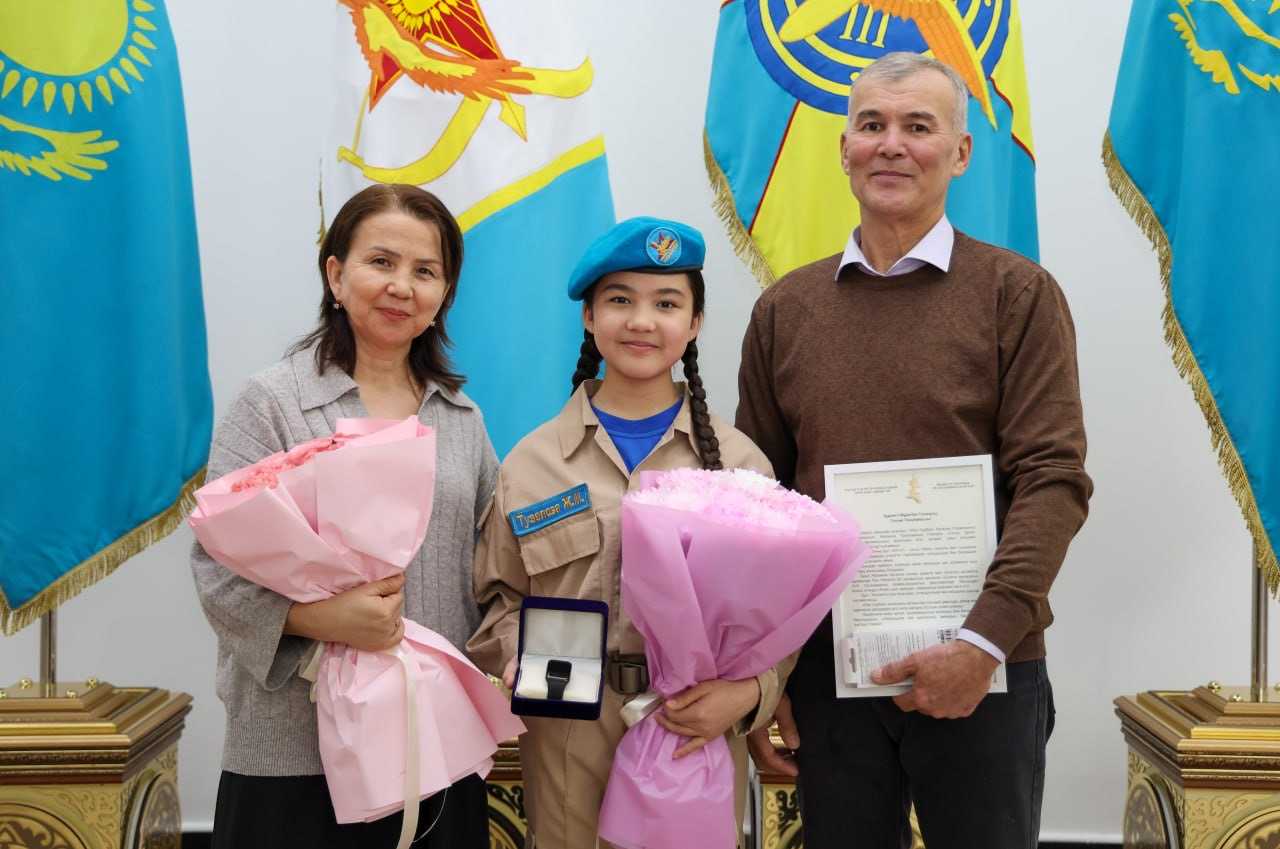 В знак признания заслуг юного дарования Даурен Косанов вручил Жасмине Тузеловой благодарственное письмо и ценный поларок. В ответ воспитанница детской студии «Жас сарбаз» исполнила легендарную песню «Әлия», чем очень растрогала участников церемонии.