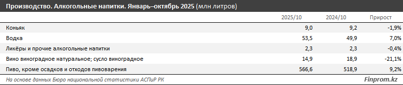 На фоне умеренного уровня потребления в стране выросло производство отдельных видов алкогольной продукции. За январь–октябрь текущего года выпуск пива увеличился на 9,2%, до 566,6 млн литров, а водки – на 7%, до 53,5 млн литров.