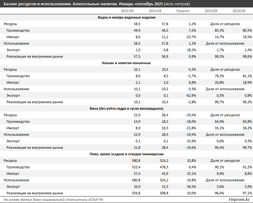 По итогам января–сентября Казахстан на 90,1% обеспечивал внутренний рынок пивом (против 91,2% годом ранее). Производство выросло на 9,4%, до 523,4 млн литров, при этом импорт увеличился на 25,1%, до 57,4 млн литров. Реализация пива на внутреннем рынке достигла 559,8 млн литров, что на 10% больше, чем годом ранее.