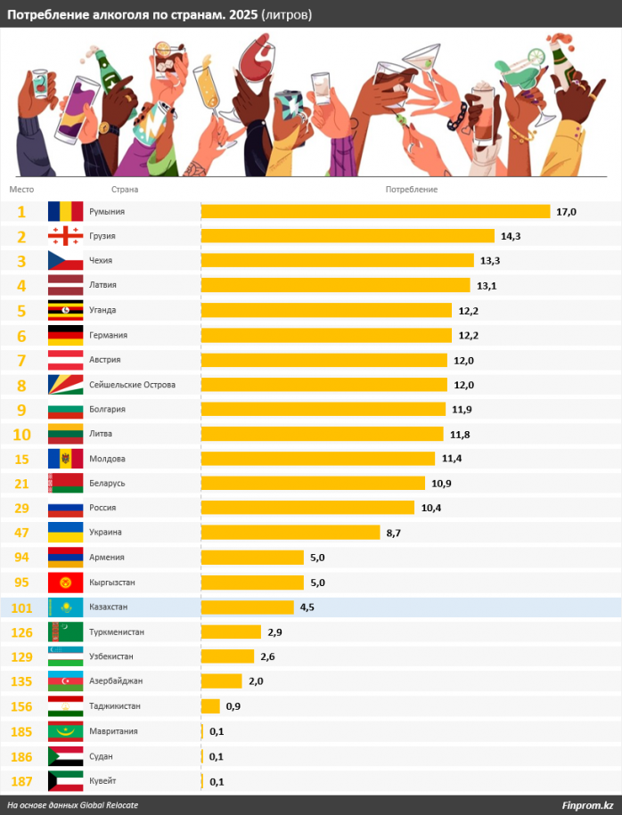 Лидерами рейтинга стали Румыния, Грузия и Чехия, тогда как самые низкие показатели зафиксированы в Кувейте, Судане и Мавритании. Среди стран СНГ уровень потребления алкоголя выше, чем в Казахстане, отмечен в Молдове, Беларуси, России, Украине, Армении и Кыргызстане. Меньше, чем в РК, употребляют алкоголь в Туркменистане, Узбекистане, Азербайджане и Таджикистане.