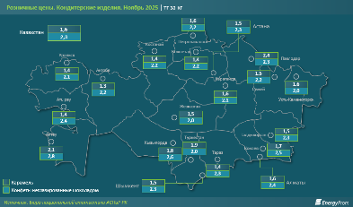 За год кондитерские изделия выросли в цене сразу на 19%. Ранее, в ноябре 2023 и 2024 годов наблюдался рост цен в секторе на 12,1% и на 12,5%. В региональном разрезе наибольшее годовое удорожание кондитерских изделий было отмечено в Северо-Казахстанской области: на 27,5%. Следом идут Астана и Жетысуская область: на 26,7% и на 26,3% соответственно. Заметный рост цен был зафиксирован также в Шымкенте (на 24,5%), Павлодарской (на 23,5%) и Алматинской (на 23,1%) областях.