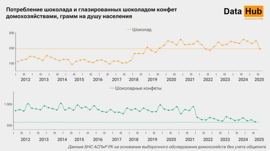 В III квартале 2025 года среднедушевое потребление шоколада в Казахстане составило 195 граммов. Это на 21% меньше по сравнению с предыдущим кварталом и на 24% ниже уровня аналогичного периода прошлого года. Такие данные приводит Бюро национальной статистики АСПиР РК на основе обследования домохозяйств, передает kazlenta.kz со ссылкой на аналитический Telegram-канал DATA HUB.